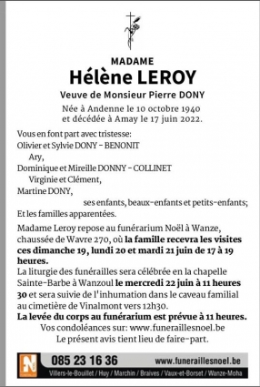 Depuis quelques années, Hélène était en maison de repos à Amay, elle est allée rejoindre Pierre, décédé en 2017, ce 17 juin 2022.