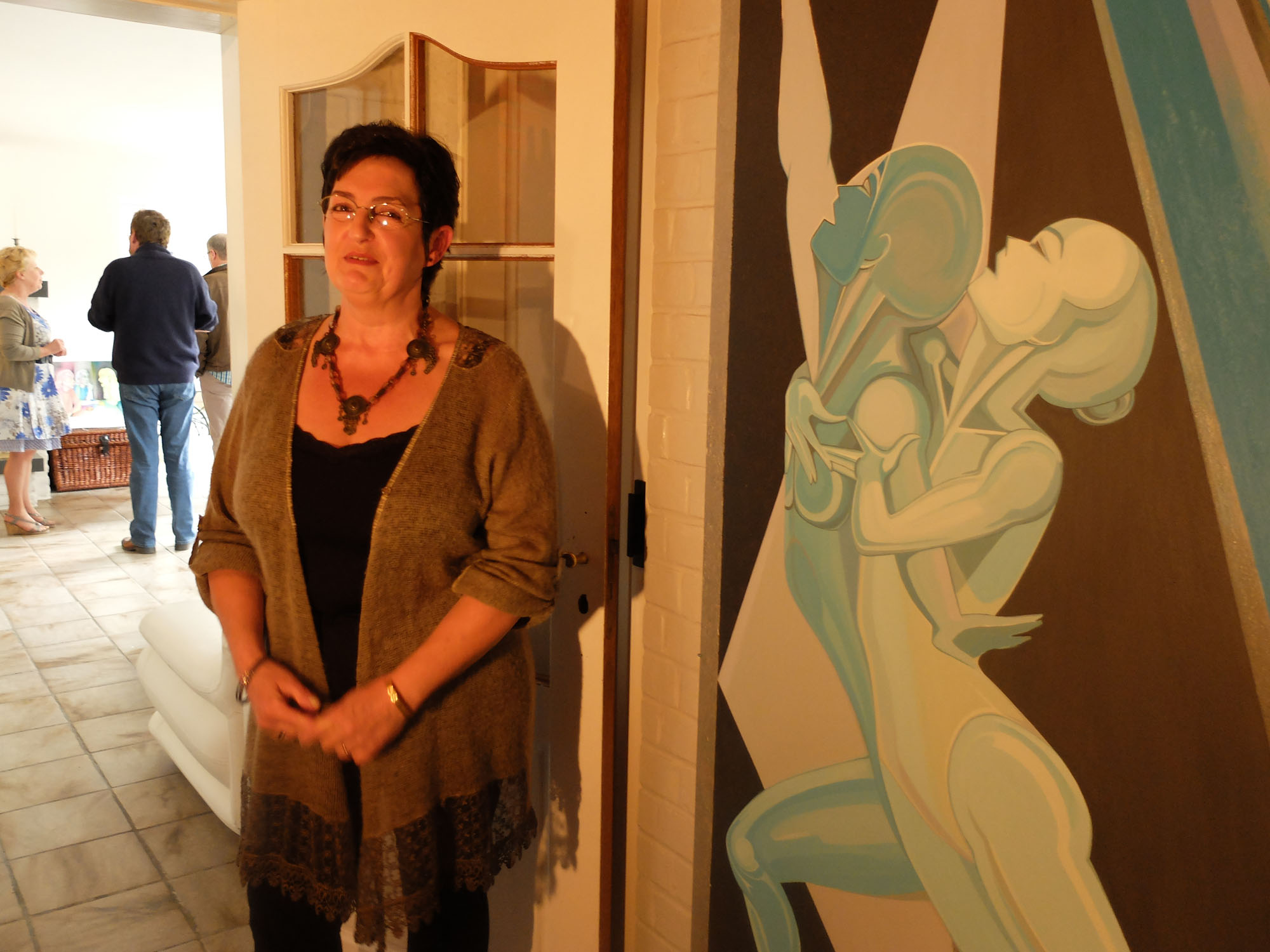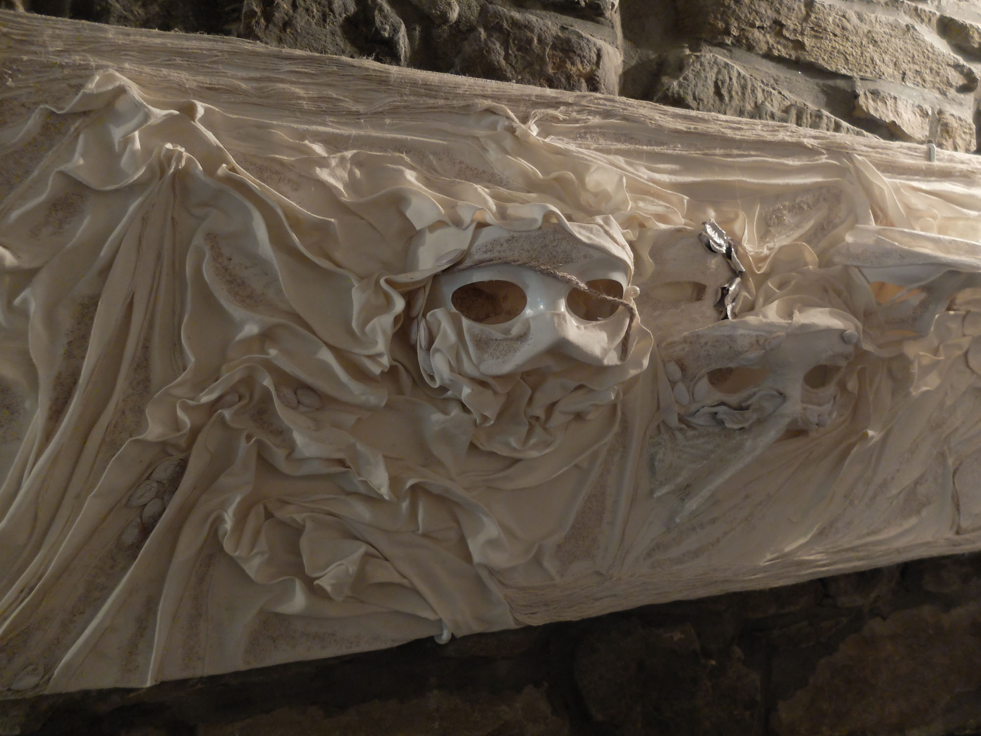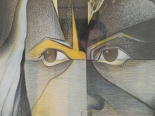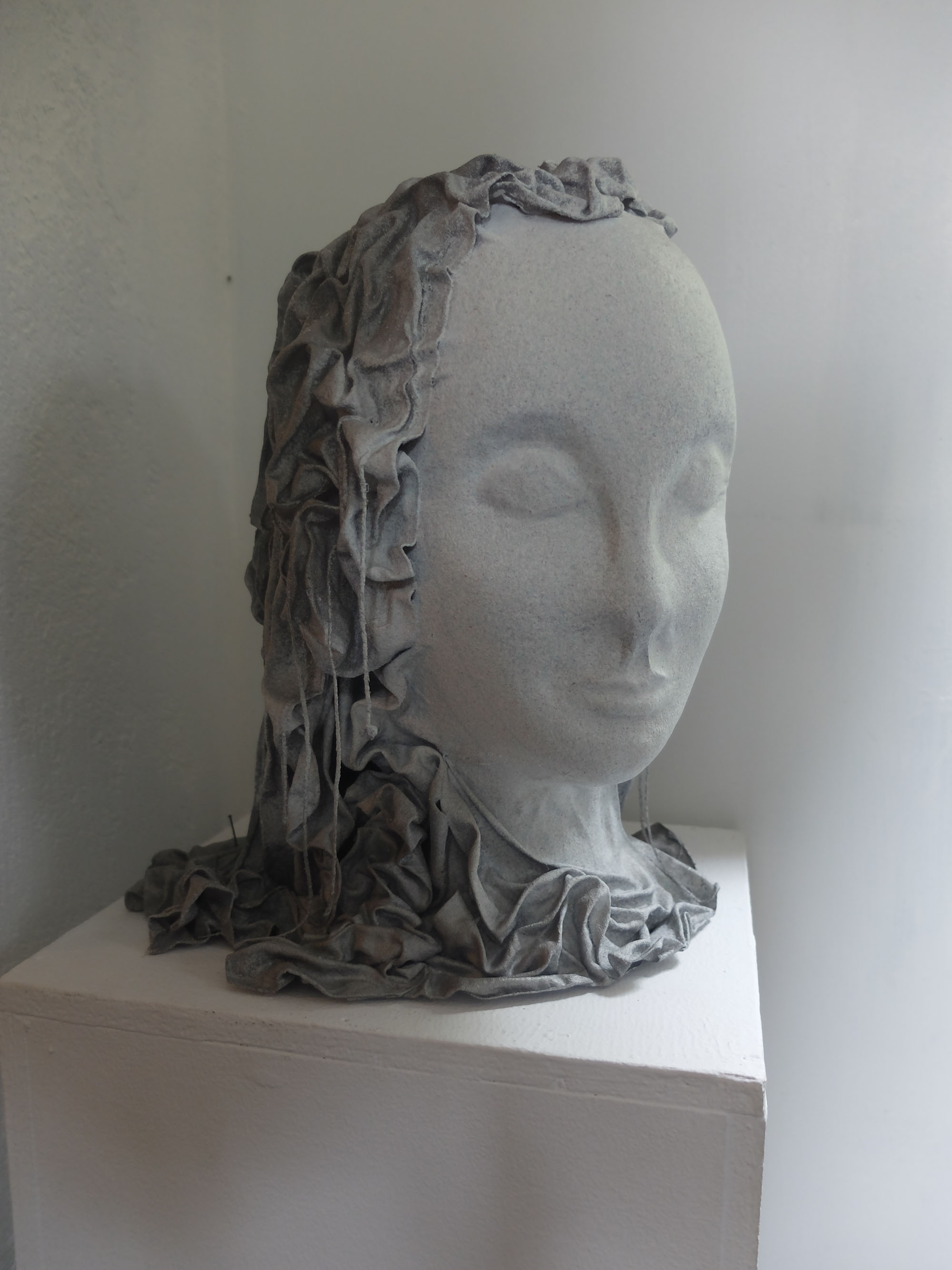 Claire Jaminon travaille les tissus trempés dans de la colle à tapisserie, le pastel et l'acrylique pour traduire l'expression d'un visage, d'un regard, d'un corps.