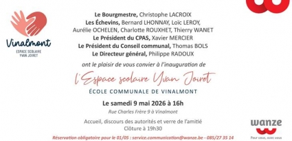 Le collège communal invite les Vinalmontois(es) qui le désirent à participer à l'inauguration du nouvel espace scolaire baptisé « Espace scolaire Yvan Joiret », une belle occasion pour ceux qui ont connu et apprécié Yvan de lui accorder une petite pensée....