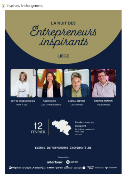 Elle prendra la parole lors de la "Nuit des Entrepreneurs Inspirants" organisée à Liège ce 12 février, expliquant l'importance du bien-être et de l'efficacité durable en tenant compte de l'aspect humain de l'entreprenariat.